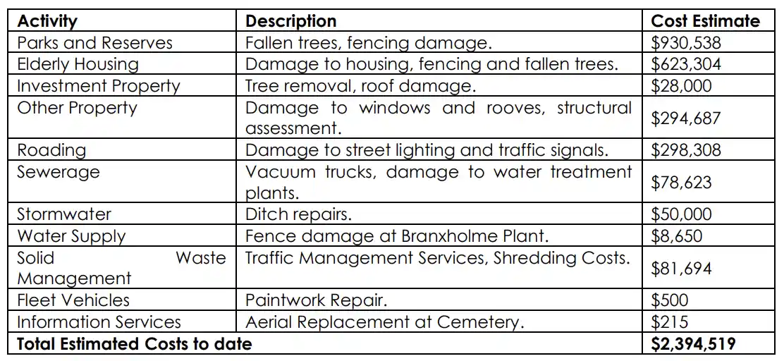 The council said insurance assessors were continuing to inspect damaged assets so quotes for repair work could be collected. The current figures do not include the cost of replanting trees, and it was also noted that the council does not budget for emergency events.