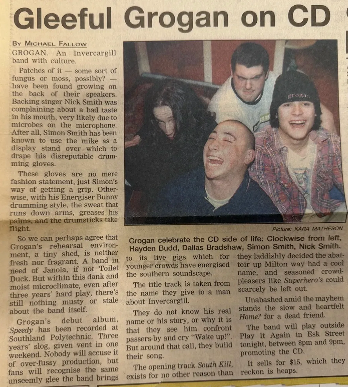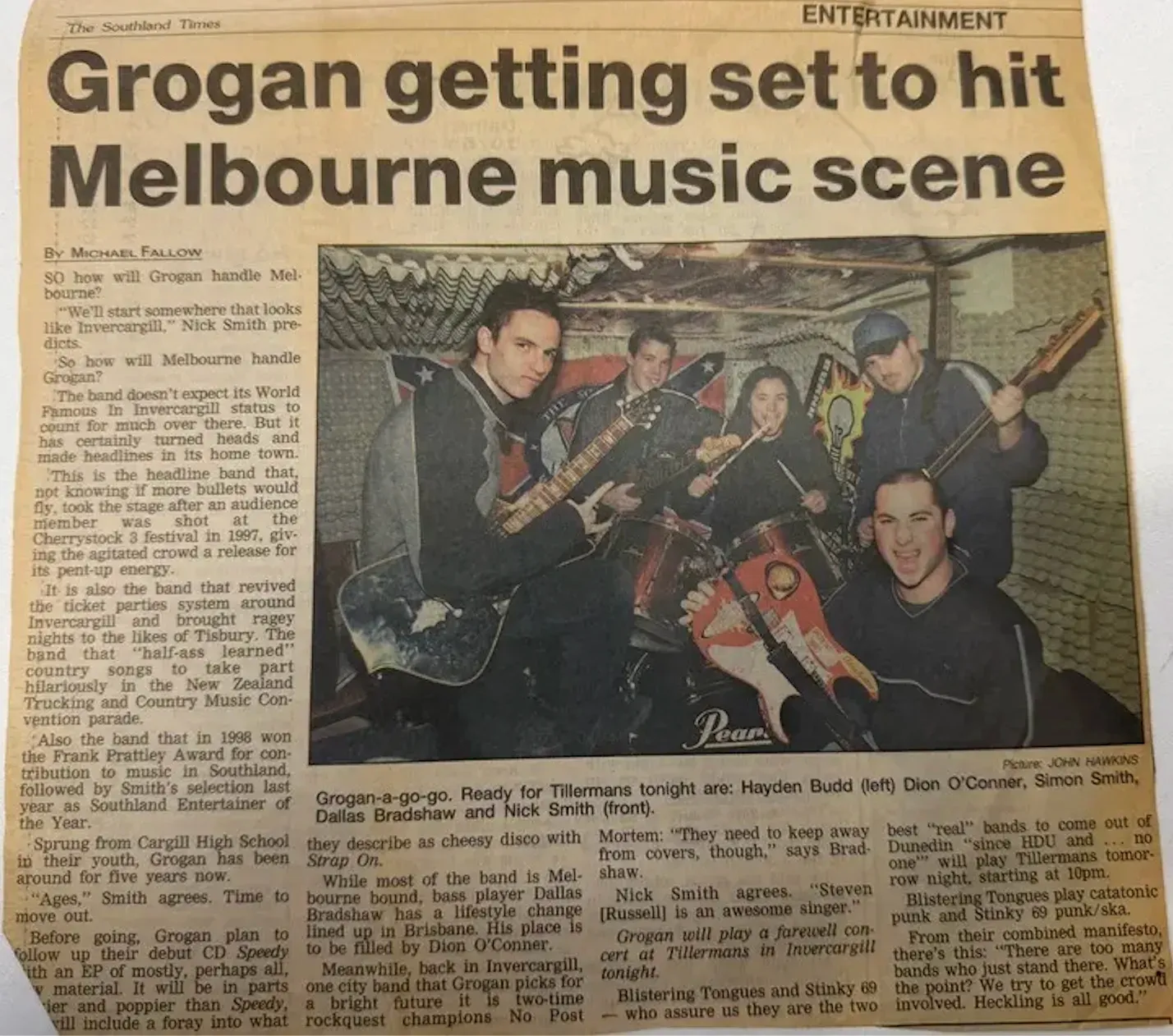 Grogan emerged from Invercargill’s vibrant scene and became known for their energetic live performances. The lineup included Nick Smith (vocals), Simon Smith, Hayden Budd, Dallas Bradshaw, and others.